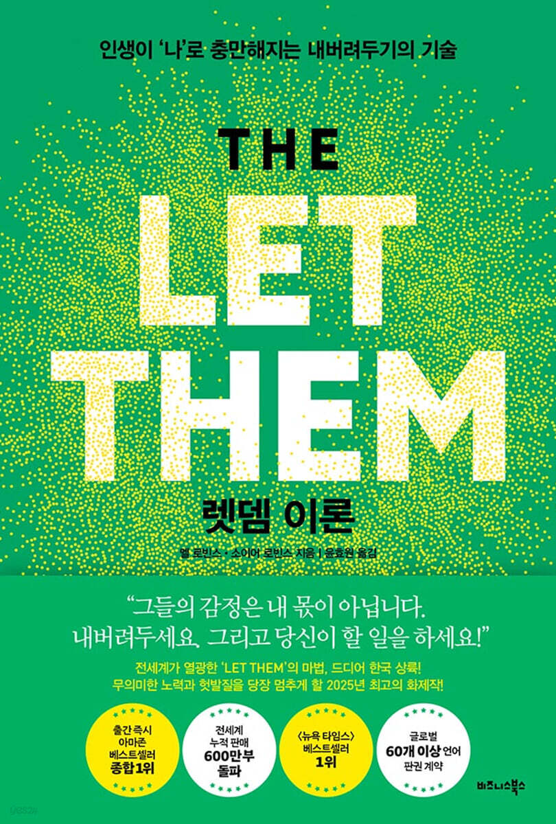저자 멜 로빈스는 이 책에서 중요하지도 않은 것들을 신경 쓰느라 나를 소모하는 싸움에서 벗어나, 진정 중요한 것 ― 즉 자기 자신, 자기 행복, 목표, 인생 ― 에 집중하는 방법을 알려준다. 통제할 수 없는 일에 에너지를 낭비하지 않는 법, 끊임없는 비교를 멈추고 두려움과 자기 의심을 극복하는 법, 타인의 기대나 평가에서 자유로워지는 법, 건강한 인간관계와 깊은 유대를 만드는 법, 중요한 목표를 자신 있게 추구하는 법, 스트레스에 대한 회복력을 기르는 법, 나만의 성공과 성취의 길을 찾는 법... 이 책은 저자가 SNS에 올린 짧은 영상이 수천만 뷰를 기록하고, ‘Let Them’ 타투 인증샷이 유행처럼 번지면서 그 화제성을 업고 출간하게 되었다. 수백만 독자의 공감과 열렬한 지지를 얻으며 출간 즉시 아마존 베스트셀러 종합 1위에 오른 《렛뎀 이론》은, 오롯이 ‘나’로 충만한 인생을 살고 싶어진 모든 이에게 행복의 잠재력을 열어줄 가장 쉽고 심플한 도구를 선물할 것이다.