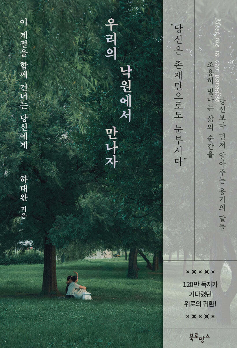 신간 『우리의 낙원에서 만나자』는 작가가 그동안 세심히 다듬어 온 사랑의 언어를 바탕으로, 삶 전반을 지나는 우리 모두의 내면과 감정을 어루만진다. 자꾸만 삶에 의심이 들고 내가 나를 지켜내는 일이 버거워지는 순간, 그럼에도 우리는 ‘함께 살아간다’는 말을 믿으며 하루를 건넌다. 하태완 작가는 말한다. “더 나은 사람이 되고픈 마음을 놓지 않는 당신, 그 모든 흔들림은 의미 있다”라고. 이번 책에서 작가는 나를 지키는 사랑과 관계 속에서 포기하지 않는 용기, 그리고 동시대를 살아가는 당신에게 보내는 응원을 이야기한다. 마치 내 삶을 다 아는 누군가가 조용히 옆에 앉아, “당신이 정말이지 자랑스럽다”라고 말해주는 격려들. 눈에 보이지 않는 마음을 더듬듯, 진심 어린 마음으로 채워진 글들은 우리를 위로하는 동시에 다시 앞으로 나아갈 힘을 준다.