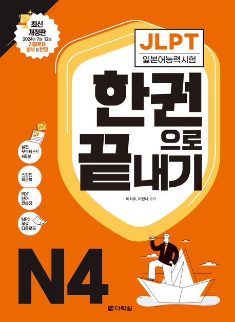 JLPT N4에서 고득점을 받을 수 있도록 시험 직전에 실제 시험처럼 연습해 볼 수 있는 실전모의테스트 4회분(별책 2회분, 온라인 2회분)과 시험 직전 필수템인 스피드 체크북을 제공한다. 다락원 홈페이지에서 온라인용 실전모의테스트(PDF)와 단어 연습장(PDF), 청해용 음성 파일(MP3)을 다운로드하여 학습에 활용할 수 있다. 청해용 음성 파일은 스마트폰으로도 바로 듣거나 다운로드할 수 있다.